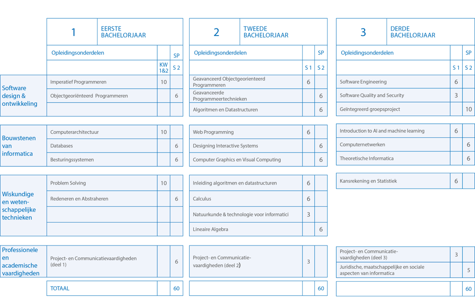 Het volledig vernieuwde studieprogramma vind je in dit document voor de volledige bachelor. Meer info over individuele opleidingsonderdelen in de bachelor informatica kan je vinden in onze studiegids of hieronder.