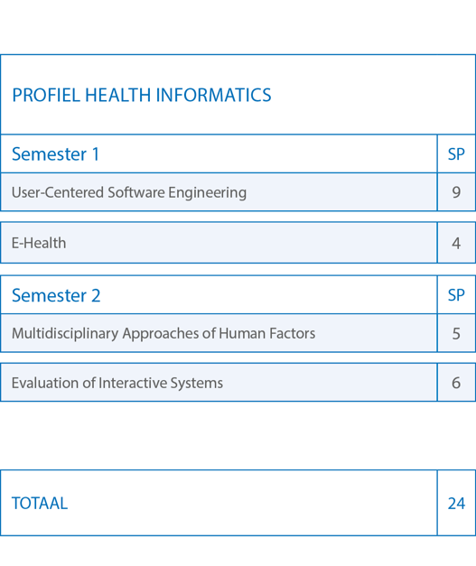 Kwalitatief hoogstaande informaticaondersteuning is uitermate belangrijk in onze gezondheidszorg. Dit domein is in volle evolutie en er is dan ook veel nood aan informatici die gespecialiseerd zijn in Health Informatics. Dit profiel biedt je de kennis en vaardigheden om medische toepassingen te realiseren en beheren. Er wordt aandacht besteed aan alle gerelateerde informaticadomeinen en je leert samenwerken met andere wetenschappelijke disciplines die betrokken zijn bij Health Informatics, waarbij je ook het voortouw neemt om de zorgtoepassingen te managen.