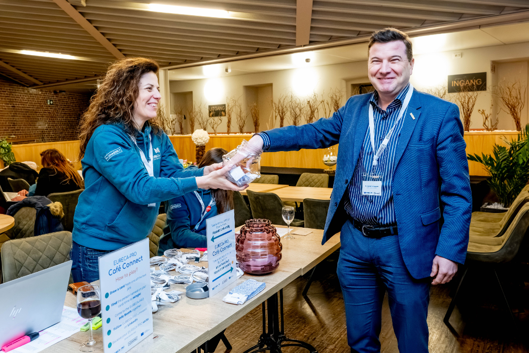 “It was wonderful to see colleagues from different countries tasting each other’s culinary traditions,” says Britte Vanlessen, Project Officer within the EURECA-PRO team. “We also introduced a small networking game called Café Connect. Colleagues from Hasselt University each drew the name of a guest from another partner institution, and vice versa. The challenge was simple: find your match somewhere in the room. Once both people had found and got to know each other, they were rewarded with a pair of EURECA-PRO socks. It was a playful way to encourage participants to move around, approach unfamiliar faces and break the ice. And it worked remarkably well! People were genuinely enthusiastic to participate and even a bit competitive when it came to winning a pair of EURECA-PRO socks.”