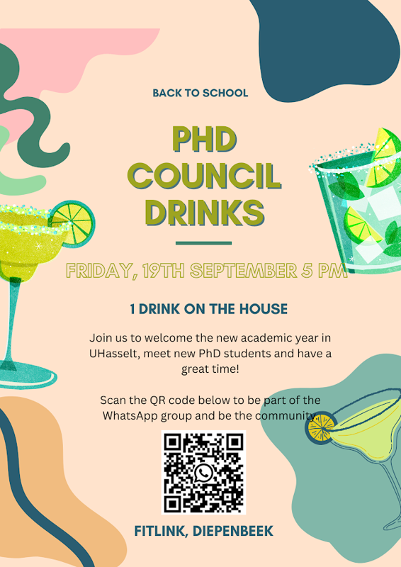 UHasselt's PhD Council invites you to have drinks together on September 19 from 17:00-19:00 in Fitlink Diepenbeek. Feel free to bring along your colleagues or partners.