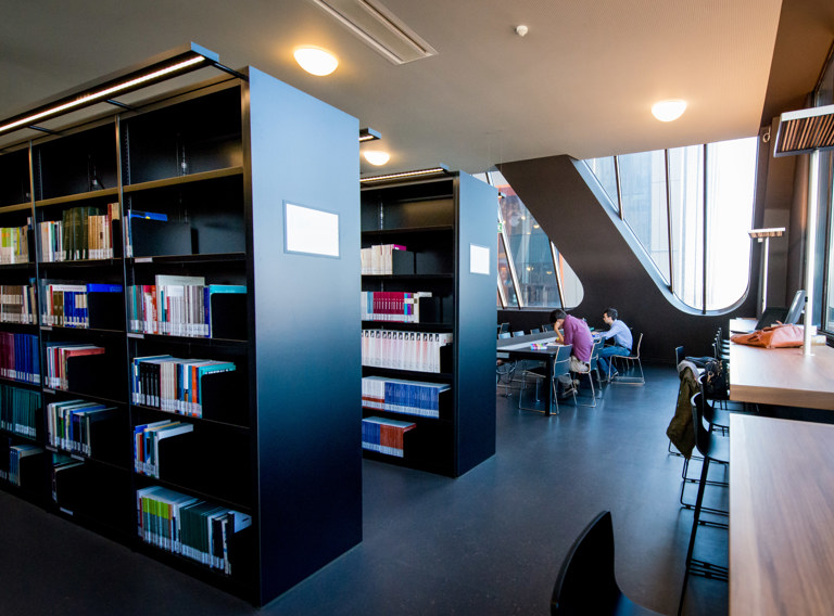 The RBL offers around eighty study spots. Here, you can conduct research and study. We expect everyone to respect the quiet and calm environment. The library also features two 'co'lab boxes,' ideal for various group work activities. In the social area at the back (the 'm'eating room'), you can take a break, chat, or enjoy your own packed lunch or coffee.