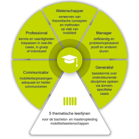 De 5 leerlijnen weerspiegelen de competenties die een mobiliteitswetenschapper na het afronden van de opleiding beheerst. Deze vaardigheden zijn onmisbaar met het oog op de latere carrière en het aanpakken van de toekomstige mobiliteitsuitdagingen.