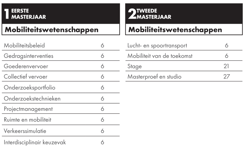 De master in de mobiliteitswetenschappen bestaat uit 120 studiepunten (2 jaar).