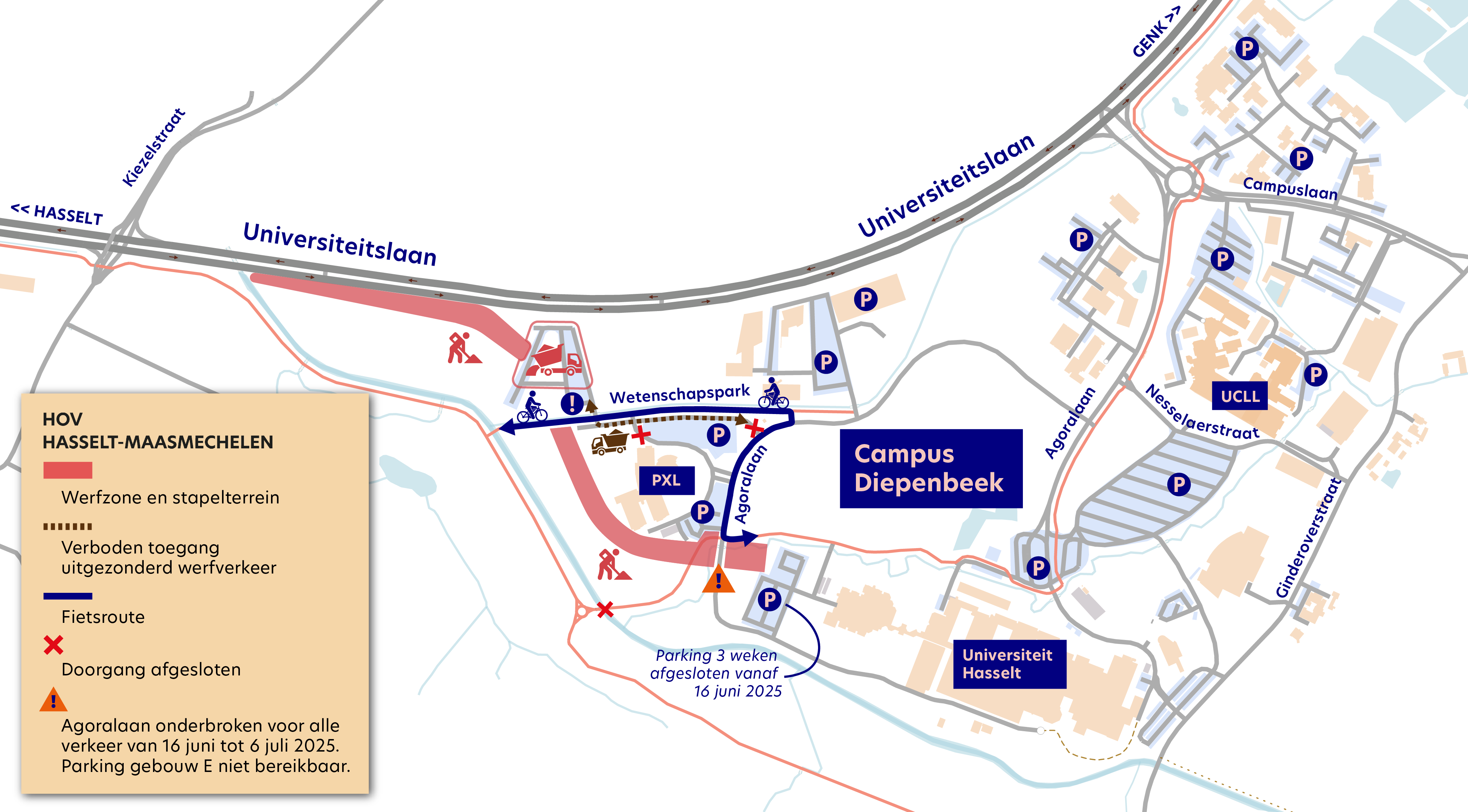 Vanaf het begin van het academiejaar 2026-2027 wordt de aansluiting met de Universiteitslaan aangepakt, samen met het noordelijke deel van de Agoralaan (Ginderoverstraat – Universiteitslaan). Deze werken nemen ongeveer een half jaar in beslag.