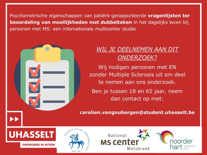 Naast onze eeuwige dankbaarheid, zal een deelname aan ons onderzoek waardevolle informatie over dubbeltaak vragenlijsten kunnen geven. Dit kan bijdragen tot een betere kennis over geschikte vragenlijsten voor dubbeltaak moeilijkheden bij personen met Multiple Sclerosis.