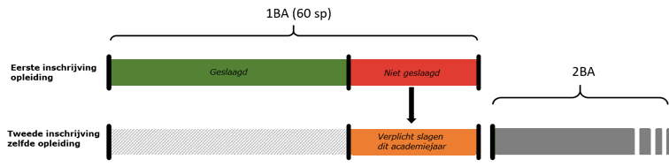 Indien je na één academiejaar niet geslaagd bent voor alle opleidingsonderdelen van eerste bachelor, mag je de vakken waarvoor je niet slaagde, het volgende academiejaar hernemen. Dat tweede jaar moet je wel slagen voor deze opleidingsonderdelen. Lukt dit niet? Ben je na twee academiejaren nog niet geslaagd voor het opo-pakket uit je eerste bachelorjaar? In dat geval volgt er een weigering voor 6 academiejaren voor deze opleiding aan alle Vlaamse universiteiten.