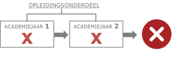 Je mag twee keer inschrijven voor een opleidingsonderdeel. Na 2 academiejaren zonder succes, volgt er een weigering van 2 academiejaren voor de opleiding en alle opleidingen waarin dit vak ook een verplicht onderdeel is.