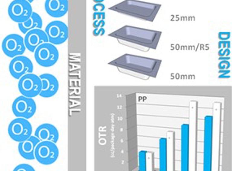 The aim of this study was to quantify the impact of thermoforming on thickness and oxygen transmission rate (OTR) of selected packaging materials (polypropylene (PP); PP/ethylene-vinyl alcohol co-polymer/PP (PP/EVOH/PP); polystyrene/EVOH/polyethylene (PS/EVOH/PE); amorphous polyethylene terephtalate/PE (APET/PE); APET/PE/EVOH/PE; polyamide/PE (PA/PE); and (PE/)PA/EVOH/PA/PE).