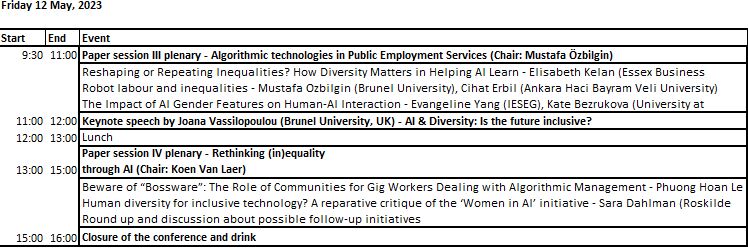 Joana Vassilopoulou (Brunel Universiteit, VK) met een lezing over AI & Diversiteit: Is de toekomst inclusief? De keynote verkent het snijvlak van kunstmatige intelligentie (AI) en diversiteit en stelt de vraag of AI het potentieel heeft om diversiteit en inclusie te bevorderen, of dat het bestaande vooroordelen en ongelijkheden kan verergeren. De keynote onderzoekt de aanwezigheid van AI in verschillende industrieën in het Verenigd Koninkrijk en het potentieel ervan als een kracht ten goede, maar belicht ook voorbeelden van AI-vooroordelen en de negatieve gevolgen van AI-management, zoals het geval van Uber-chauffeurs in Londen. De rol van AI in human resources wordt ook besproken, evenals de oorsprong van discriminatie en vooroordelen in AI.
