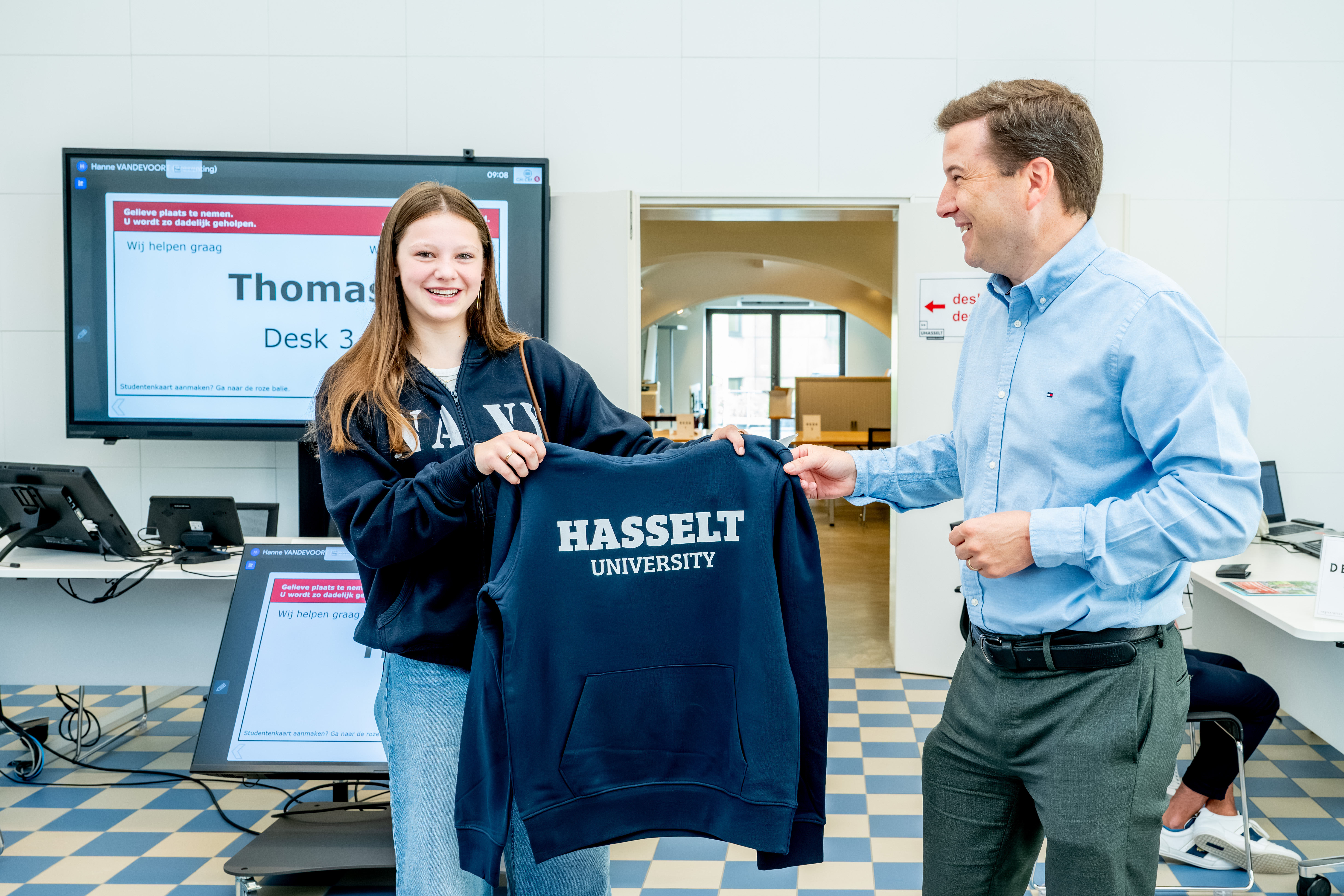 De twee eerste ingeschreven studenten werden vanmorgen persoonlijk ontvangen door Bernard Vanheusden, rector van UHasselt. Allebei ontvingen ze een cadeaubon van 50 euro van de campusshop en net als alle andere nieuw ingeschreven studenten kregen ook zij een hoodie van Universiteit Hasselt.
