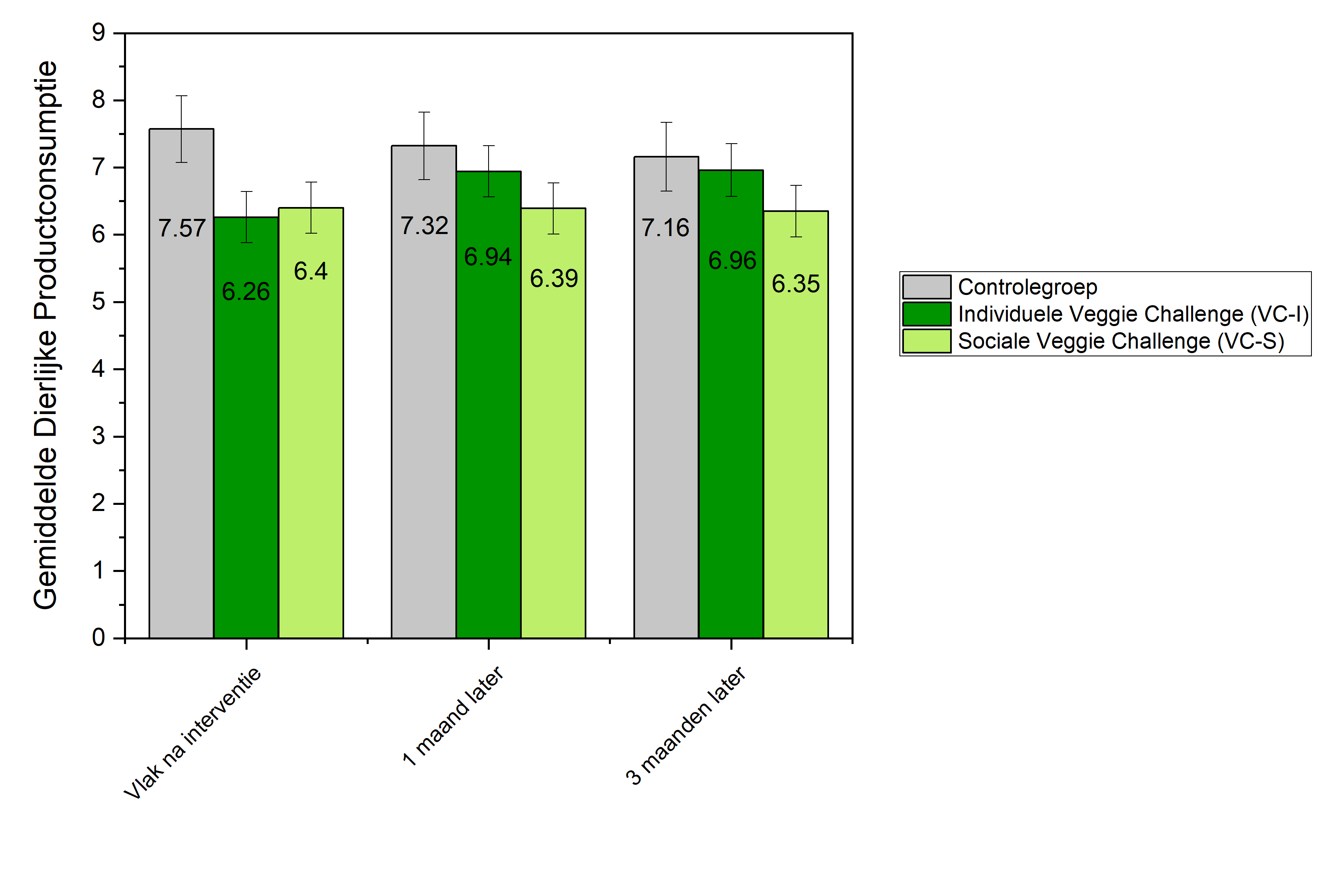 Na de 30 dagen bleek de gemiddelde consumptie van dierlijke producten (vlees, vis, zuivel en eieren) in zowel de individuele als de sociale groep 16-17% lager te liggen dan in de controlegroep, een statistisch significant verschil. De consumptie van vlees lag zelfs 22-27% lager. Tussen de individuele en sociale groep onderling waren op dat moment geen significante verschillen te zien. Heel anders was dat bij een volgende meting, een maand later: de gemiddelde consumptie van de individuele groep veerde terug, bijna tot hetzelfde niveau als dat van de controlegroep. In de sociale groep hield de verlaging echter stand. Ook bij de laatste meting, na drie maanden, bleef de dierlijke productconsumptie in de sociale groep significant verlaagd met 11% ten opzichte van de controlegroep (zie grafiek). De vleesconsumptie in de sociale groep was na drie maanden zelfs nog steeds 25% lager ten opzichte van de controlegroep.