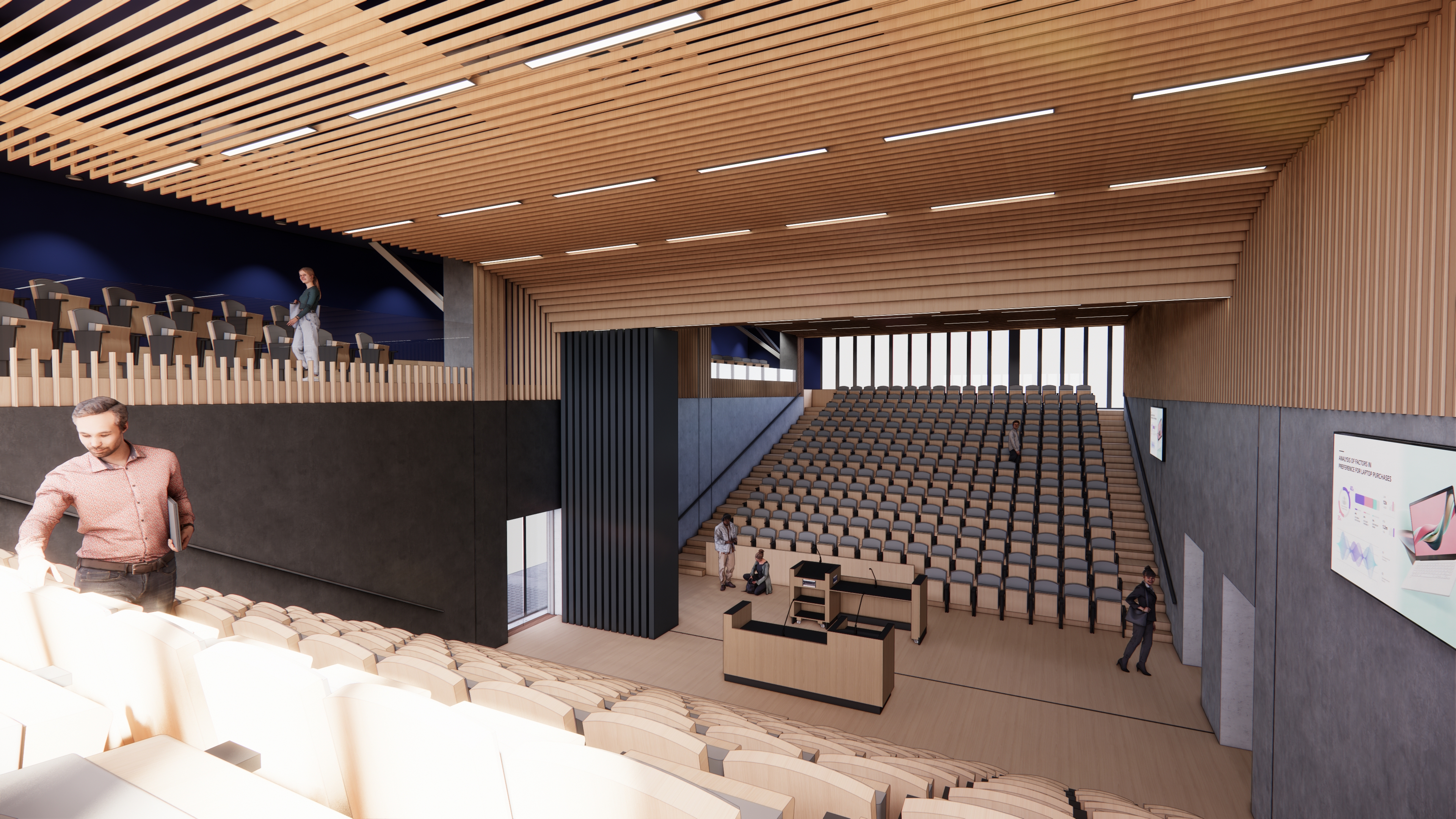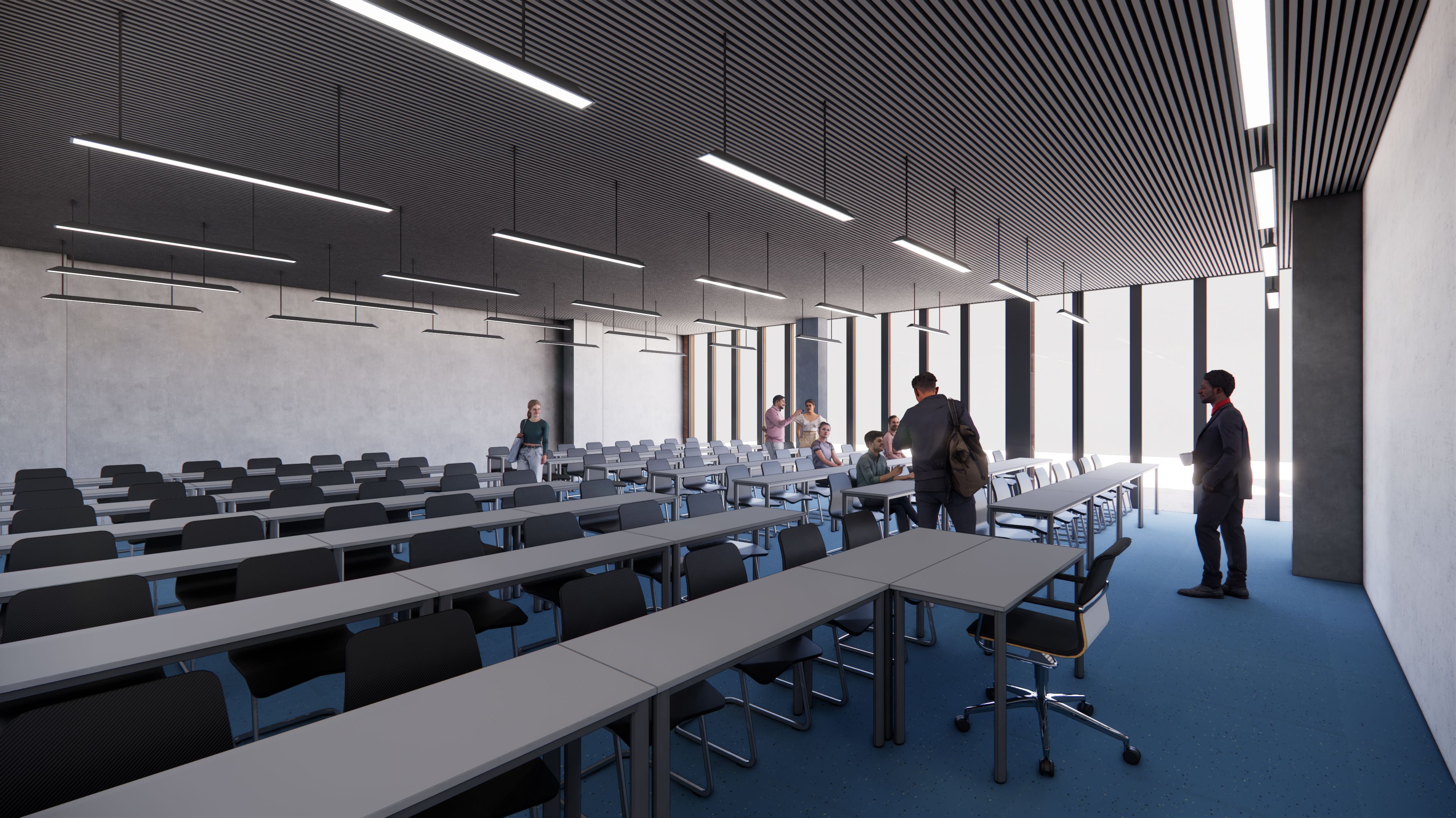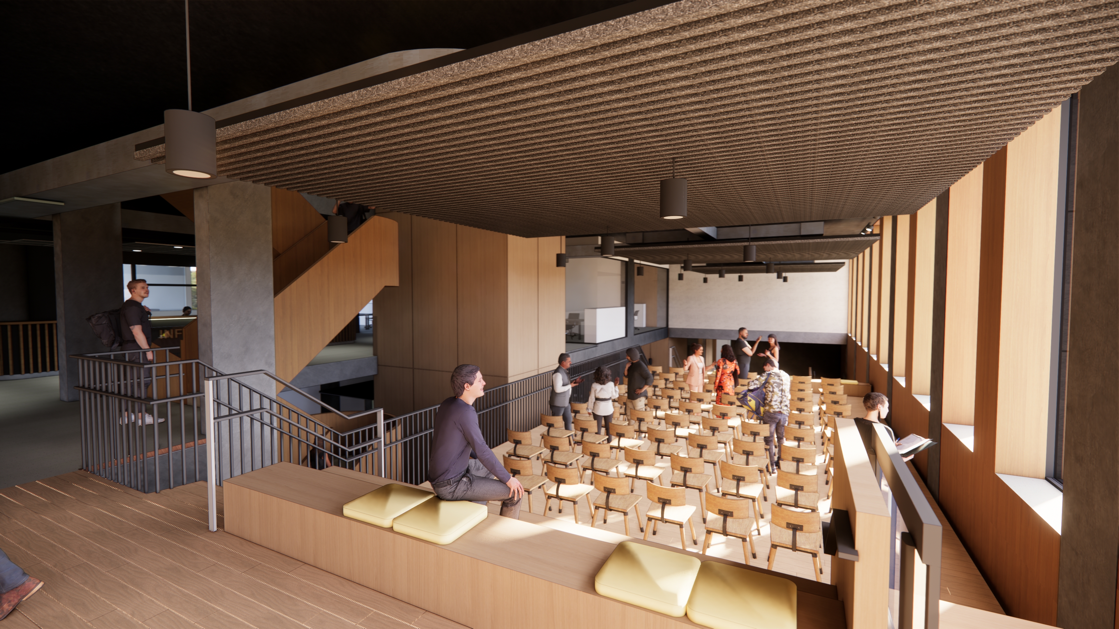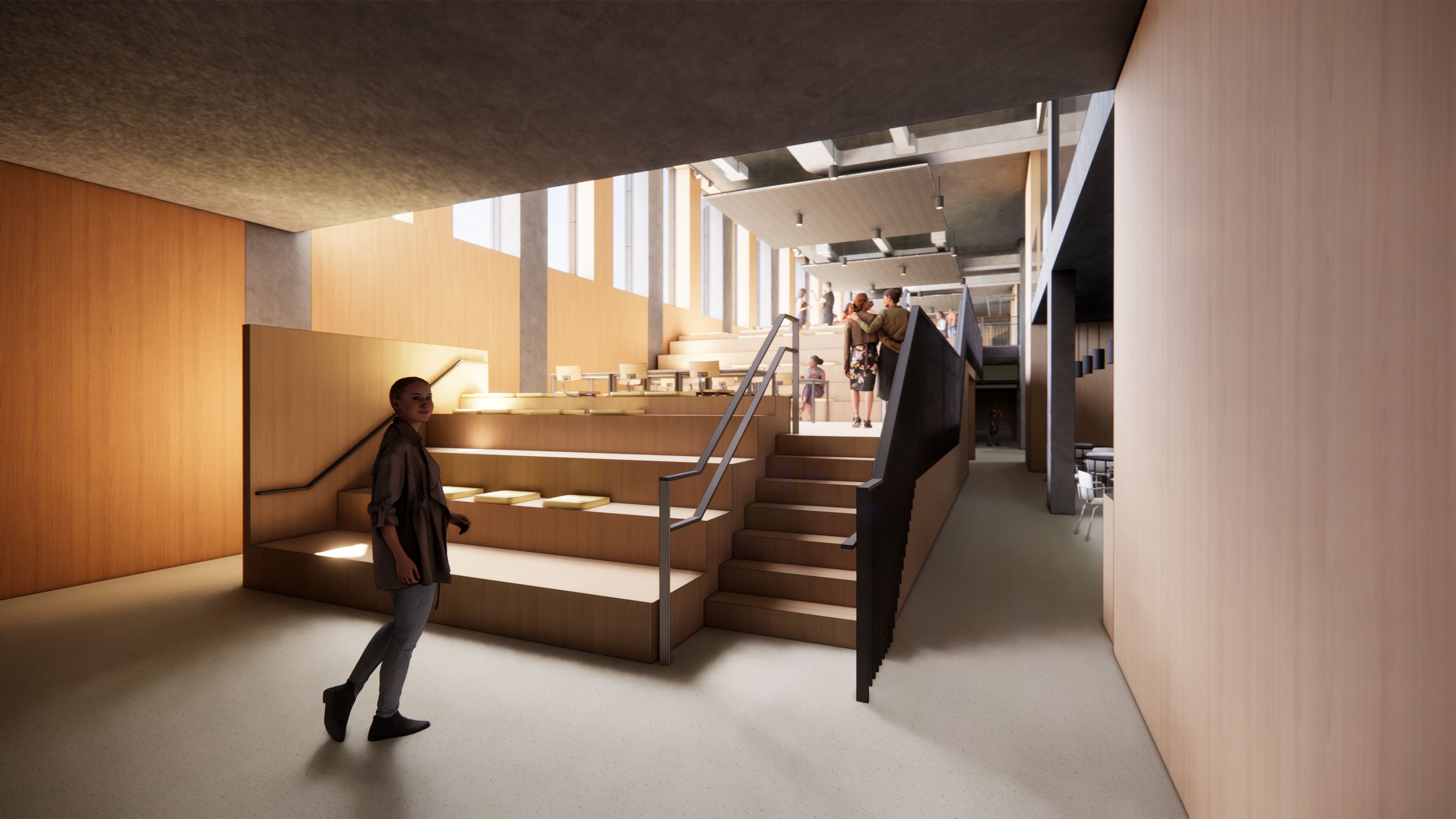 “Het architectenbureau heeft een heel open en transparant gebouw ontworpen, waar ontmoeten centraal staat. De eerste drie verdiepingen zijn het ‘onderwijshuis’ met naast 4 aula’s, 24 leslokalen ook veel studie- en ontmoetingsplekken en onze dienst Studentenvoorzieningen. Van de vier beschikbare aula’s zijn er twee ook koppelbaar, zodat je er één geheel van kan maken met 450 zitplaatsen. Aan de ingang komt er ook een agora zoals op campus Diepenbeek, waarbij een open trappenpartij voor zitplekken zorgt en studenten elkaar kunnen ontmoeten, en waar er ruimte is voor posterpresentaties, beurzen en andere evenementen.”