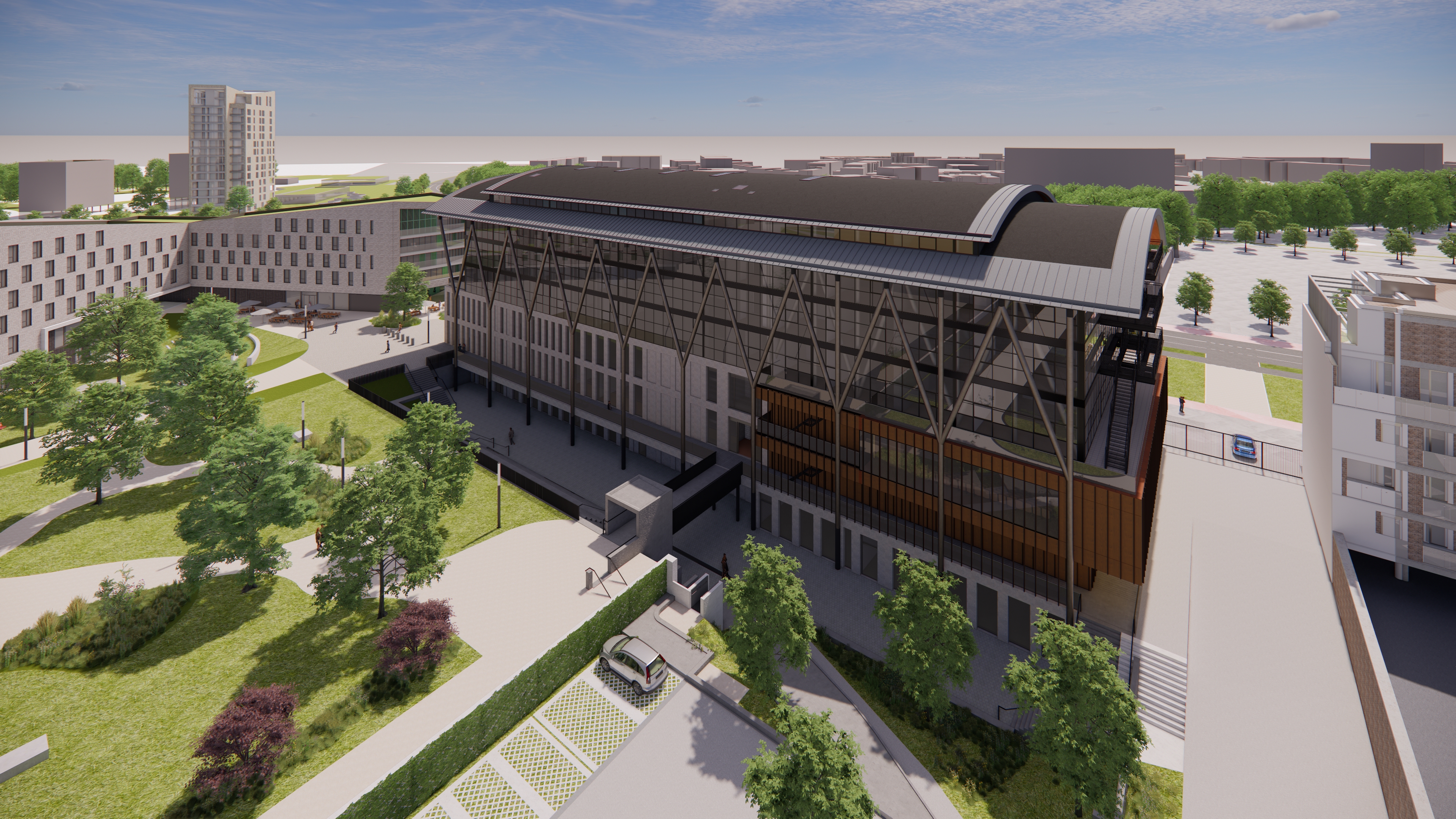 Vlak naast het campusgebouw wordt er nu al volop gewerkt aan nieuwe studentenhuisvesting en de komst van een studentenrestaurant op de site. “Dit zijn geen UHasselt-projecten, voor alle duidelijkheid”, zegt Bruno Janssen. “Maar het sluit natuurlijk wel perfect aan bij de site. Tussen de verschillende gebouwen komt een mooi parkgebied dat de gebouwen met elkaar verbindt en ook verbinding met de omgeving mogelijk maakt. Hier is iedereen welkom.”