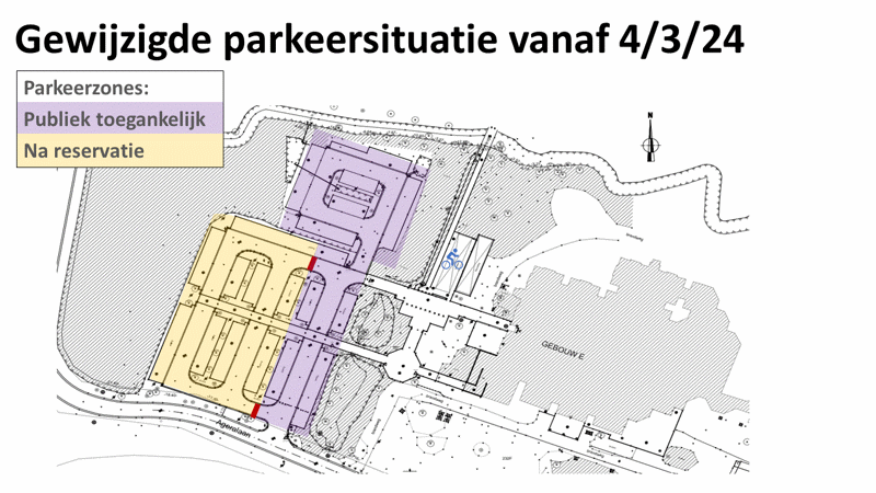 We begrijpen dat studenten soms veel of zwaar materiaal bij hebben. Daarom hebben we een drop off zone voorzien op het publiek toegankelijke gedeelte van de parking van gebouw E. Hier kan je gedurende 30 minuten parkeren, mits je een blauwe parkeerschijf achter je voorruit legt met het uur van aankomst, terwijl je je materiaal op de campus zet. Deze zone wordt aangeduid door een blauw bord 'met drop off zone' (momenteel is nog 15 minuten aangeduid maar dit wordt binnenkort aangepast op vraag van studenten naar 30 minuten).