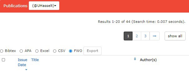 - Vervolgens selecteer je alle publicaties die je wilt toevoegen aan je profiel in het FWO e-loket door de selectievakjes naast elke gewenste publicatie aan te duiden. Als je al je publicaties wilt selecteren, klik je eerst op 'Show all' en vink je het selectievakje naast 'Issue Date' aan.