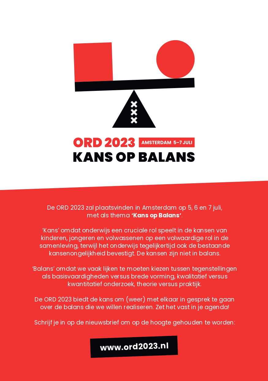 Tijdens de Onderwijs Research Dagen worden resultaten van onderwijsonderzoek gepresenteerd en uitgewisseld. De ORD zijn in de loop van ruim 40 jaar uitgegroeid tot een onmisbaar forum voor Nederlandse en Vlaamse onderwijsonderzoekers.