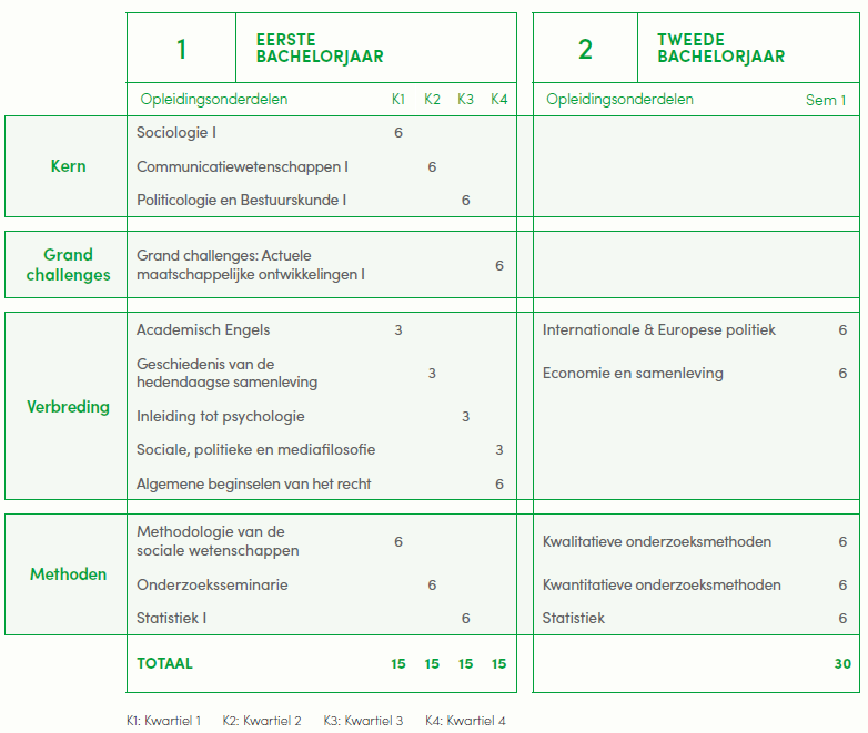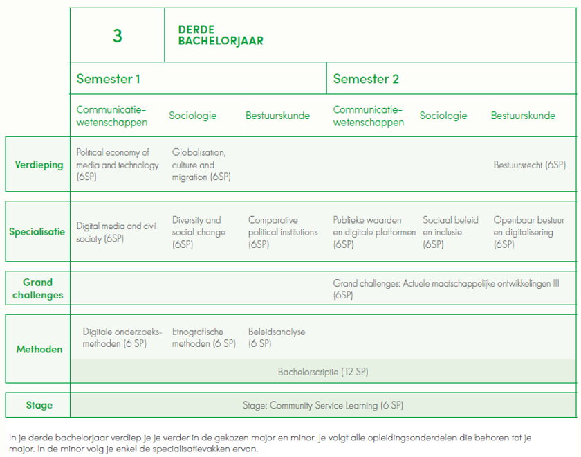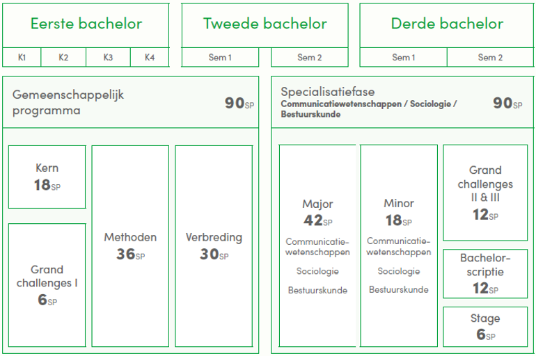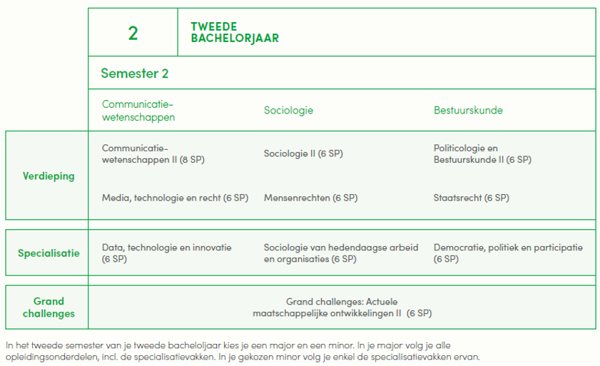 Bij UHasselt kiezen we resoluut voor een multidisciplinaire aanpak omdat je als sociale wetenschapper moet beschikken over een breed perspectief. Je verwerft diepgaande kennis in communicatiewetenschappen, sociologie en bestuurskunde. Je komt daarbij ook in aanraking met andere disciplines zoals economie, rechten, data sciences… Op die manier ben je goed voorbereid om in je tweede bachelorjaar een specialisatie te kiezen. Dankzij de juiste mix van brede, geïntegreerde vakken en gespecialiseerde opleidingsonderdelen beschik je na je bacheloropleiding over alle academische kennis en vaardigheden die je nodig hebt om de samenleving waarin je leeft beter te begrijpen en te veranderen.